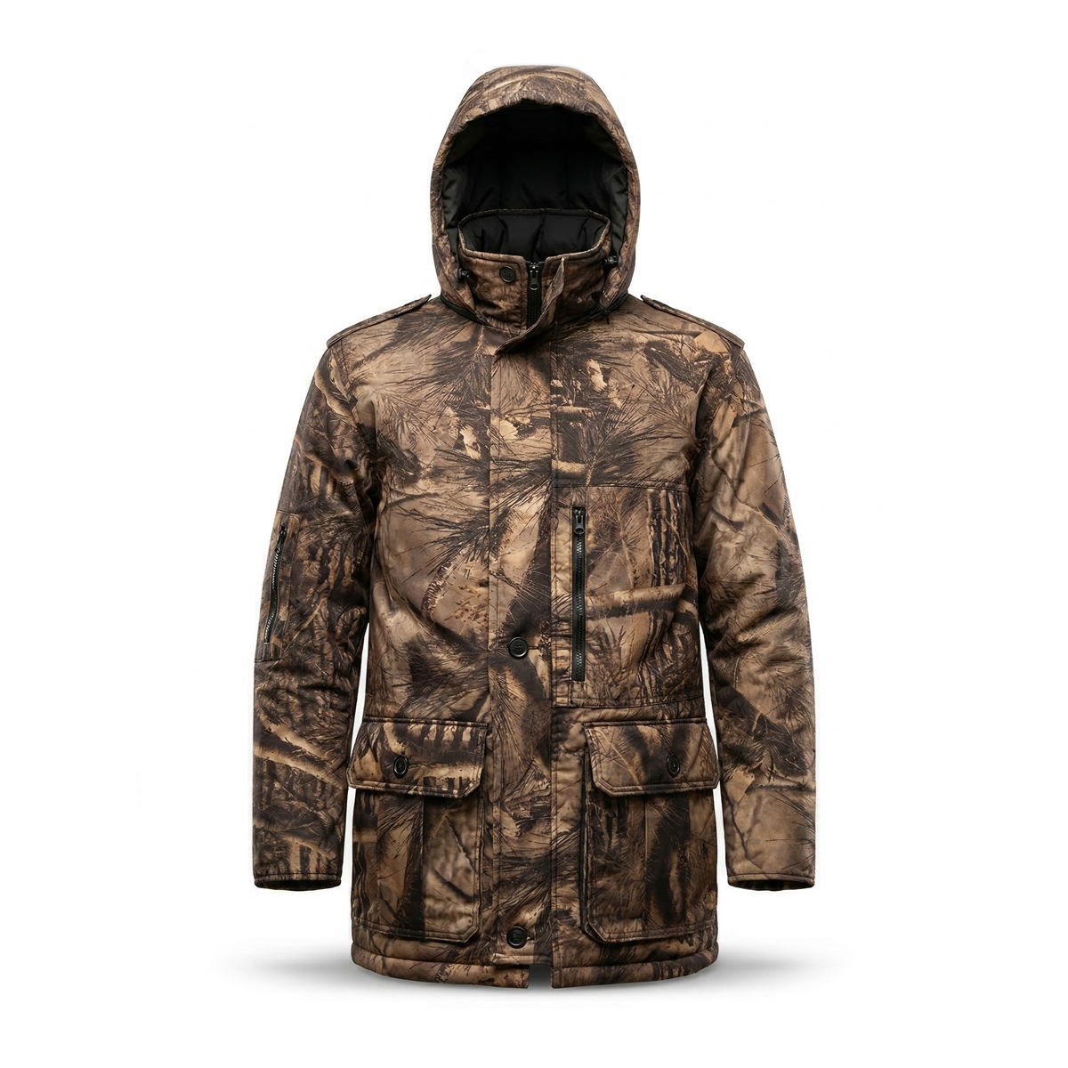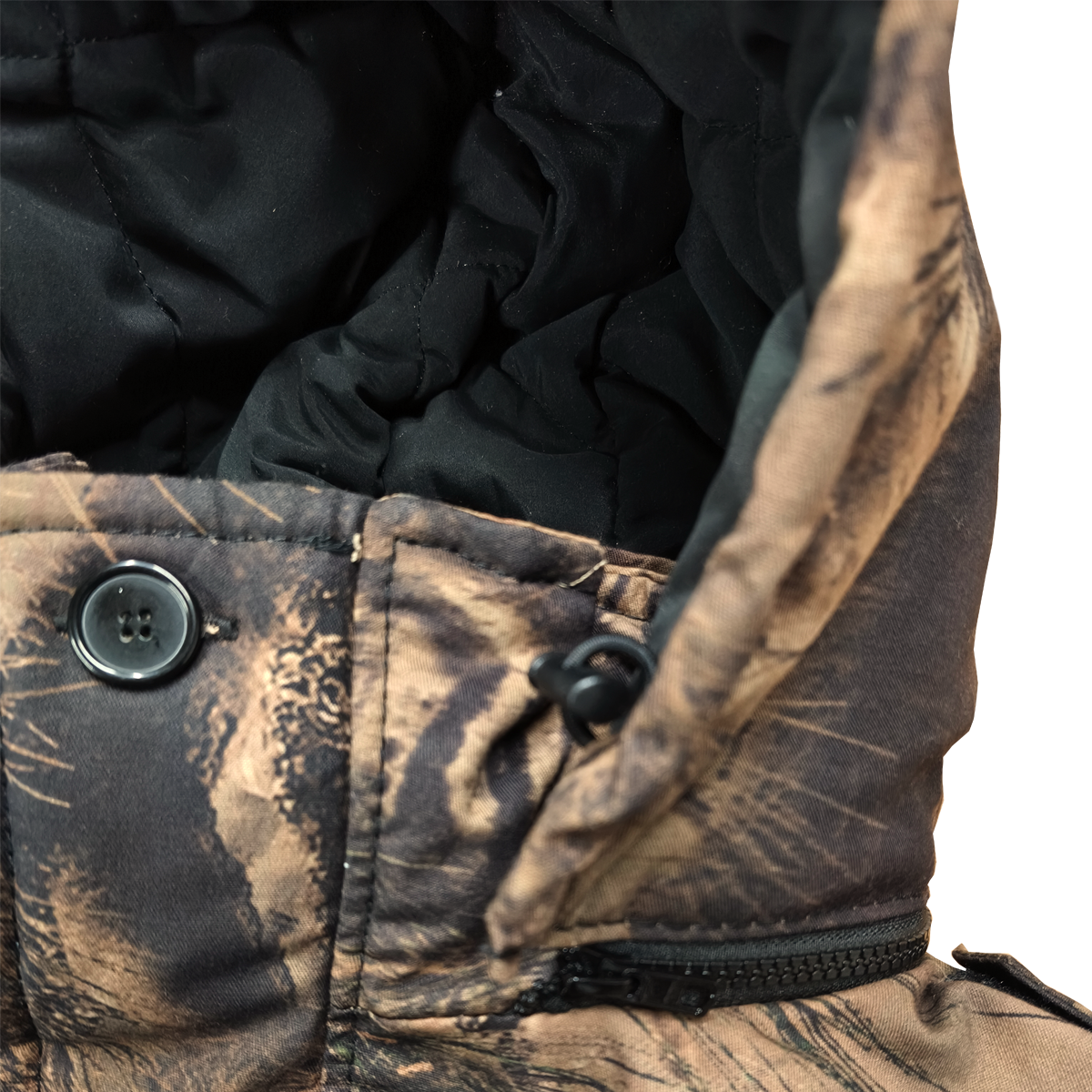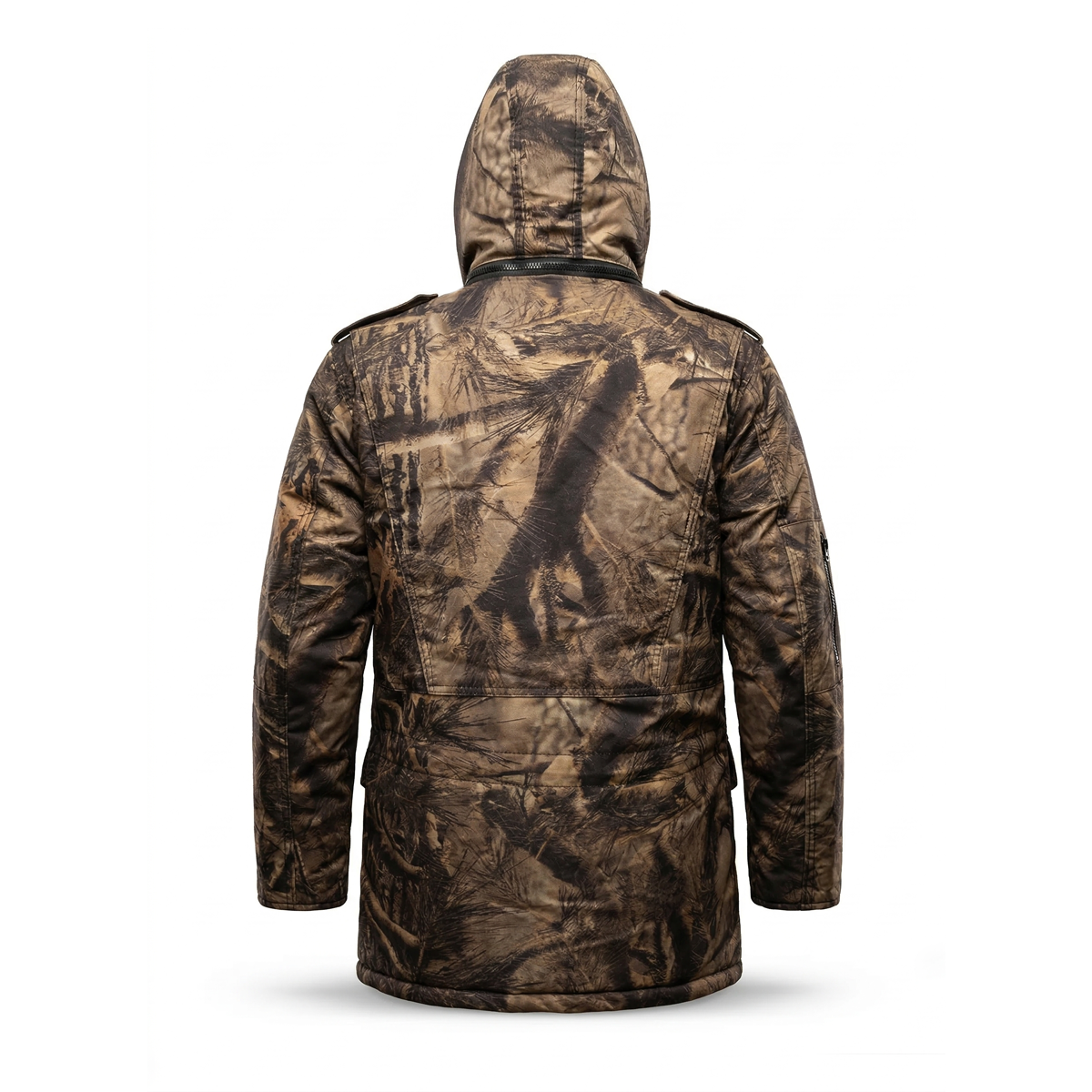 - Ergonomía adaptativa: Gracias al fuelle incorporado en la espalda, la parca permite extender los brazos con total libertad (para apuntar o trabajar) sin que la prenda se tense o se desplace. Además, los cordones de ajuste en cintura y ruedo permiten cerrar el paso al viento frío.